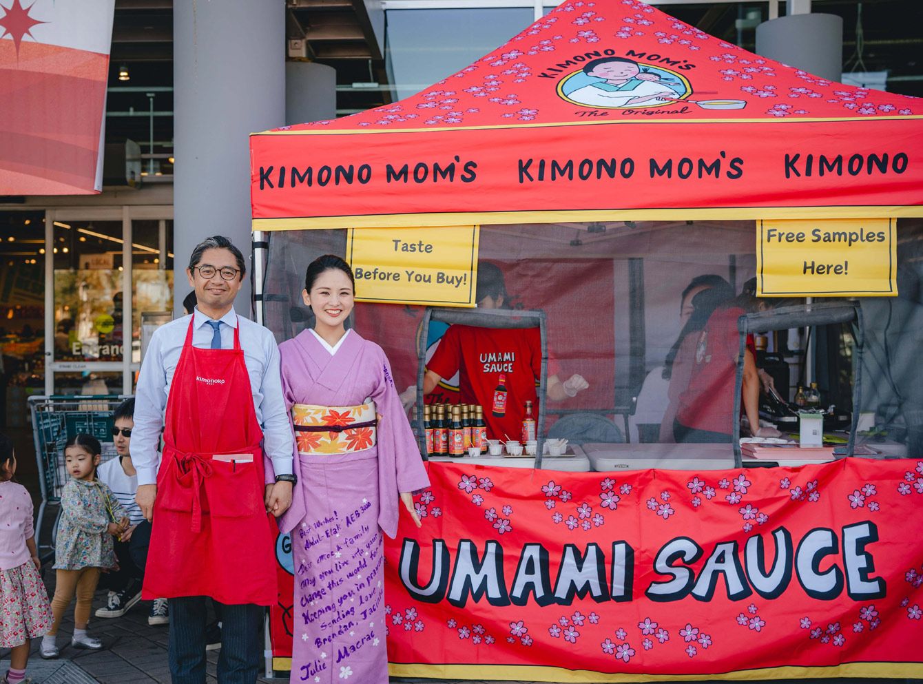 今年1月、テキサス州オースティンのショッピングセンターで、自身が開発したウマミソースの試食販売をするモエさん夫妻