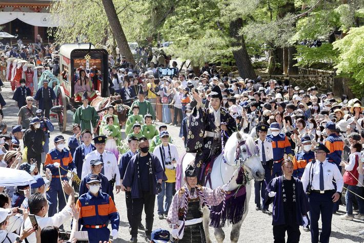 「源義経公東下り行列」で白馬にまたがり、手を振る源義経役の寺田心さん=2024年5月3日午後、岩手県平泉町