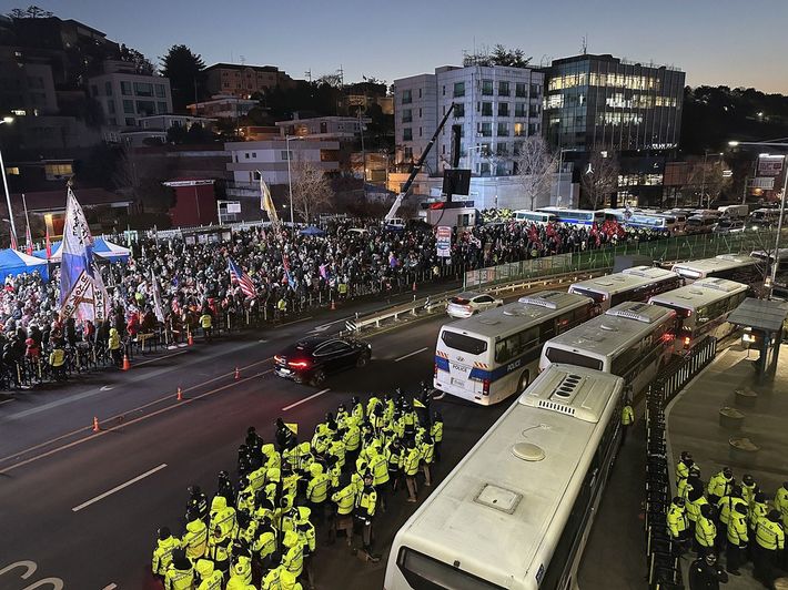 親ユン派のデモ参加者。黄色い制服を着た警官を乗せた多数の警察車両が群衆鎮圧の準備を整える(写真=Seefooddiet/CC-BY-SA-4.0/