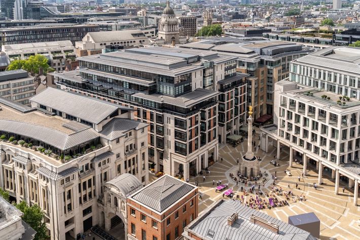 セント・ポール大聖堂から眺めたパターノスター広場。ロンドン証券取引所は写真の向かって右側の建物に入っている。