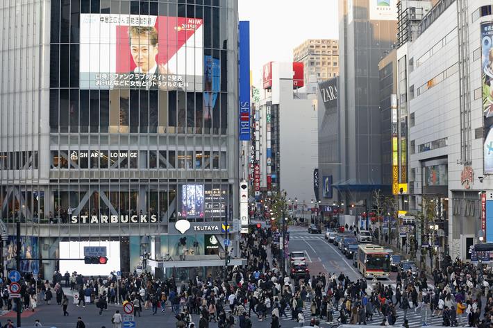 タレントの中居正広さんが芸能活動を引退することを伝える街頭モニター(左上)=23日午後、東京・渋谷