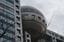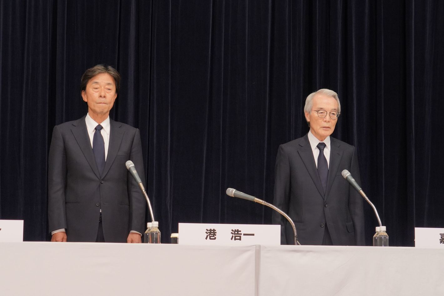 フジテレビの嘉納修治会長(右)と港浩一社長=東京・台場のフジテレビ