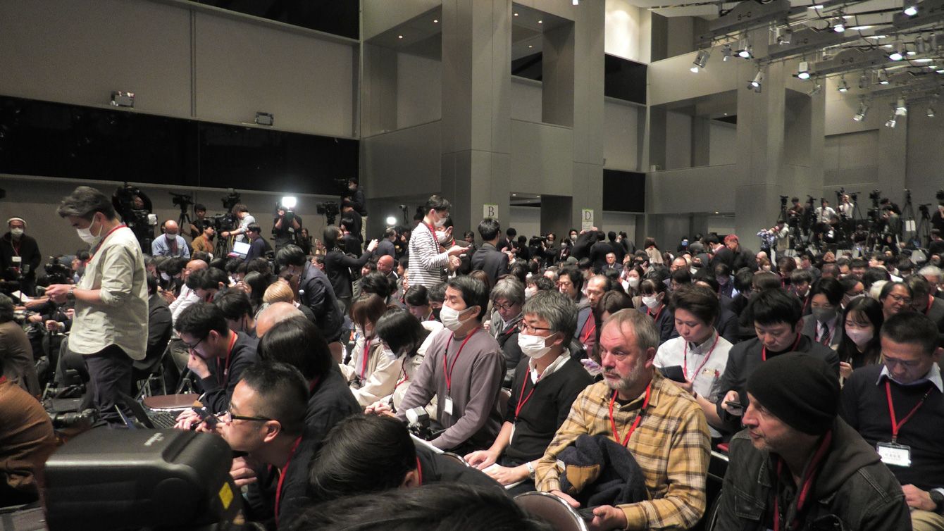 28日のやり直し会見に集まった大勢の報道陣