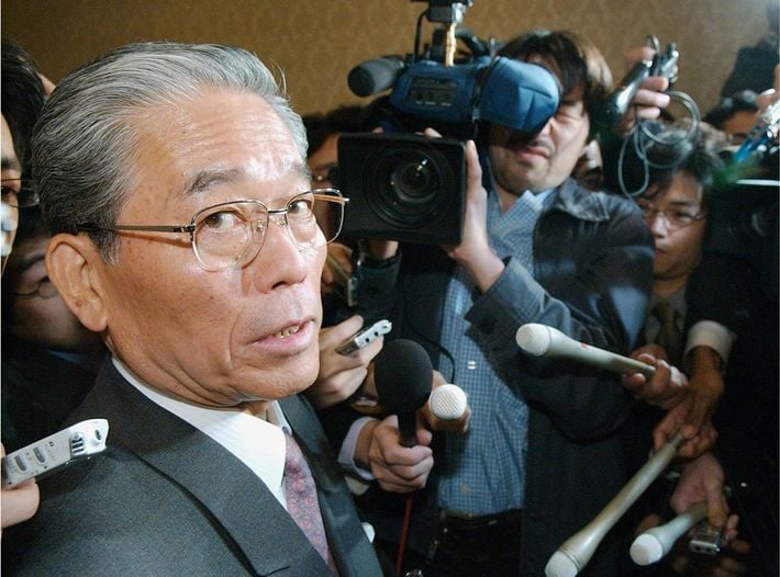 記者に囲まれるフジテレビの日枝久会長=2005年3月17日午後、東京都千代田区のホテル