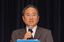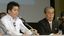 記者会見するフジテレビの日枝久会長(右)とライブドアの堀江貴文社長※肩書きは当時=2005年4月18日、東京都港区