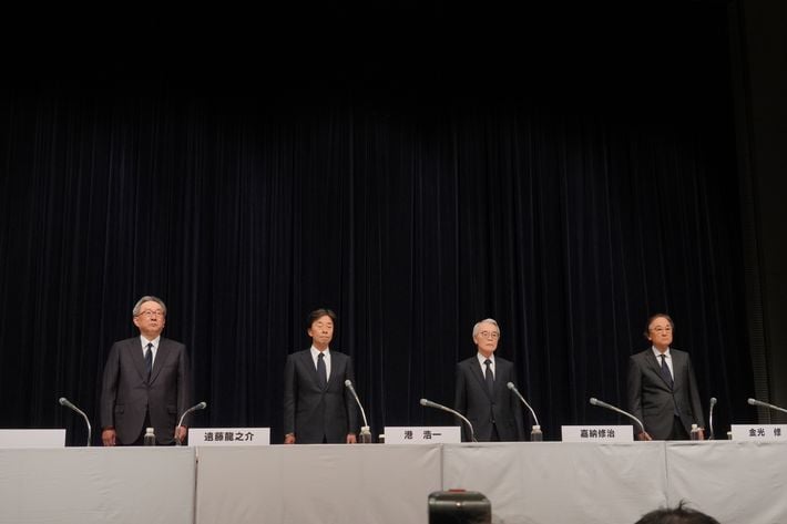記者会見に出席したフジテレビの港浩一社長(左から2人目)、嘉納修治会長(同3人目)ら(2025年1月27日)