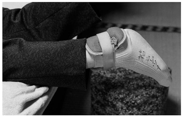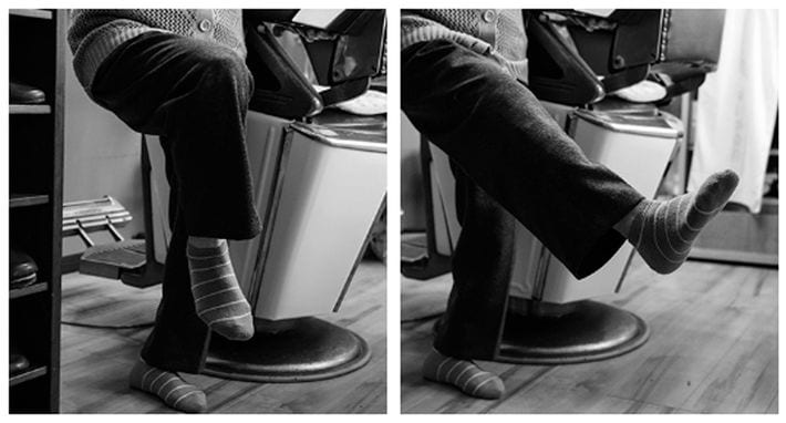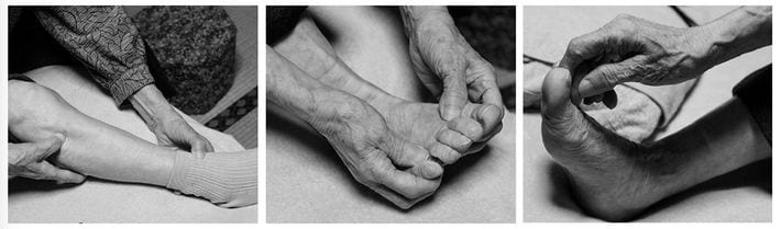 【図版26】足の甲や裏など全体をゆっくりマッサージ。指も1本ずつ、付け根から爪に向かってゆっくりほぐすように。関節もていねいに。爪はぐっぐっと押してから、キュッと引っ張って離す。[出所=『108歳の現役理容師おばあちゃん』/撮影=栗栖誠紀]