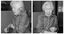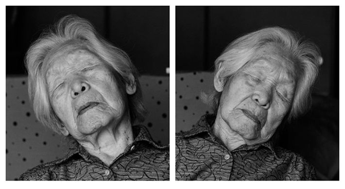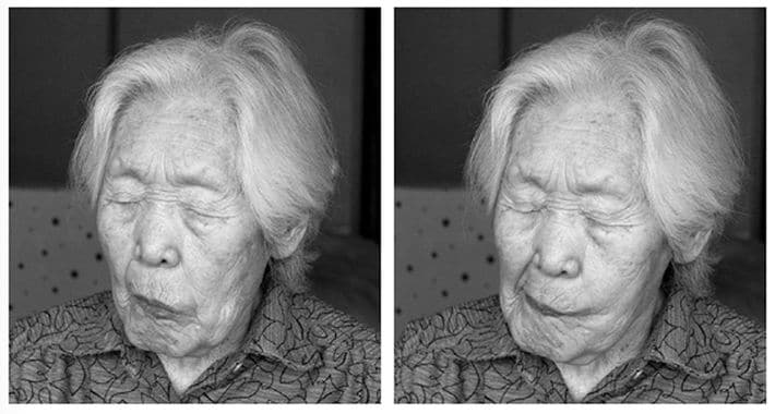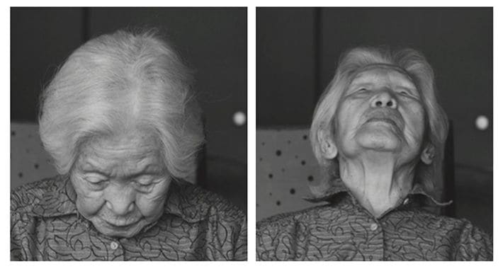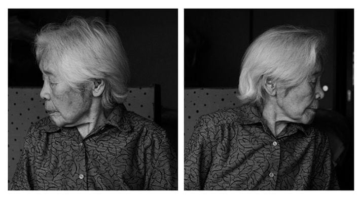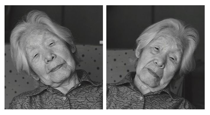 【図版2】頭を右に倒して左側の首筋を伸ばす(左)。頭を左に倒して右側の首筋を伸ばす(右)。[出所=『108歳の現役理容師おばあちゃん』(宝島社)/撮影=栗栖誠紀]
