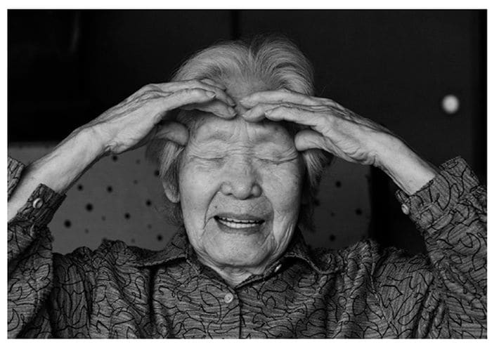 【図版20】指や手のひら全体を使って頭をマッサージ。指先に力を込めておでこを押す。眉から上へ、髪の生え際に向かって。[出所=『108歳の現役理容師おばあちゃん』(宝島社)/撮影=栗栖誠紀]