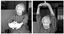 【図版17】両手を組んでひっくり返し前に押すように伸ばす(左)。そのまま、上に引っ張られるように伸ばす(右)。[出所=『108歳の現役理容師おばあちゃん』(宝島社)/撮影=栗栖誠紀]