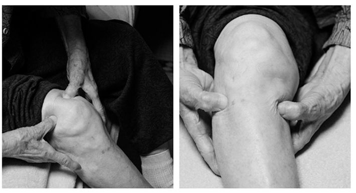 【図版24】膝の周りを親指で押しながらマッサージ(左)。「足三里」のあたりも(右)。[出所=『108歳の現役理容師おばあちゃん』(宝島社)/撮影=栗栖誠紀]