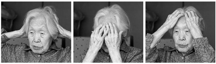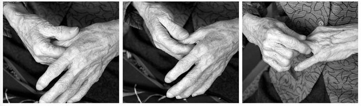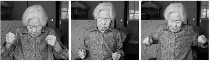 【図版16】指を組み、指や手のひらに力が入るかチェック。[出所=『108歳の現役理容師おばあちゃん』(宝島社)/撮影=栗栖誠紀]