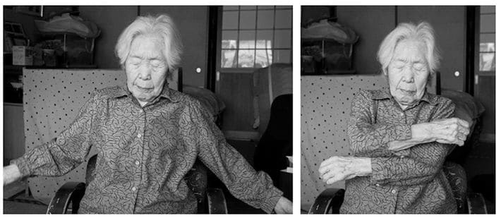 【図版10】息を吸いながら両腕を広げて胸を開く(左)。息を吐きながら腕をクロス(右)。[出所=『108歳の現役理容師おばあちゃん』(宝島社)/撮影=栗栖誠紀]