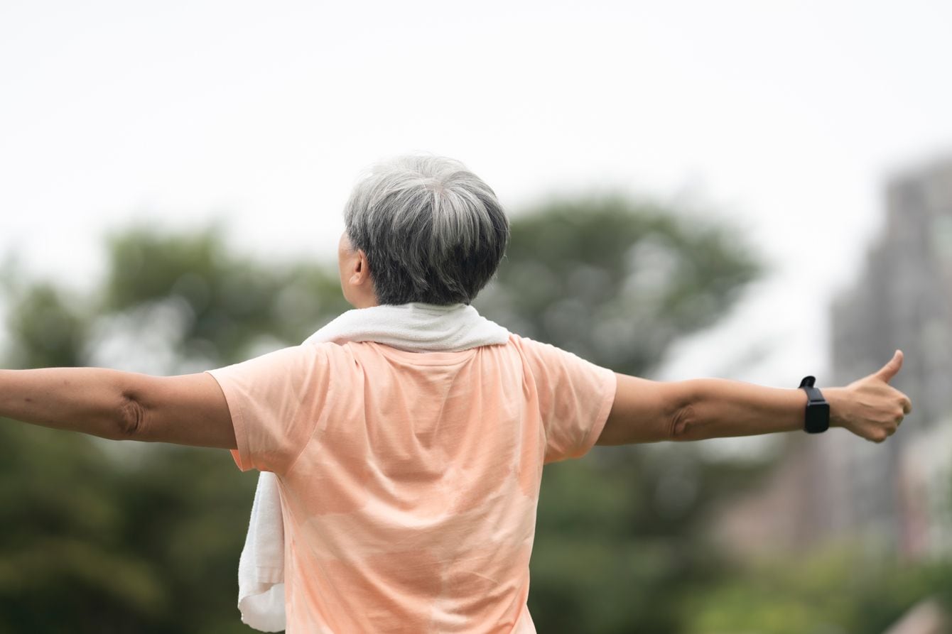 【図版21】両腕を上に伸ばして深呼吸。[出所=『108歳の現役理容師おばあちゃん』(宝島社)/撮影=栗栖誠紀]