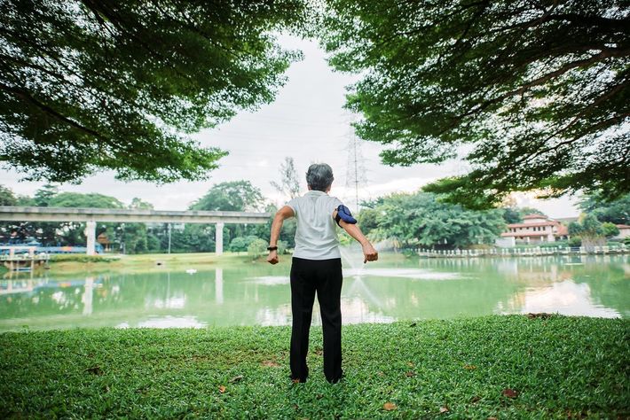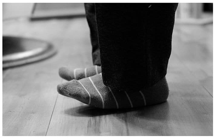 【図版29】かかと上げ。バランスを崩さないように。[出所=『108歳の現役理容師おばあちゃん』(宝島社)/撮影=栗栖誠紀]