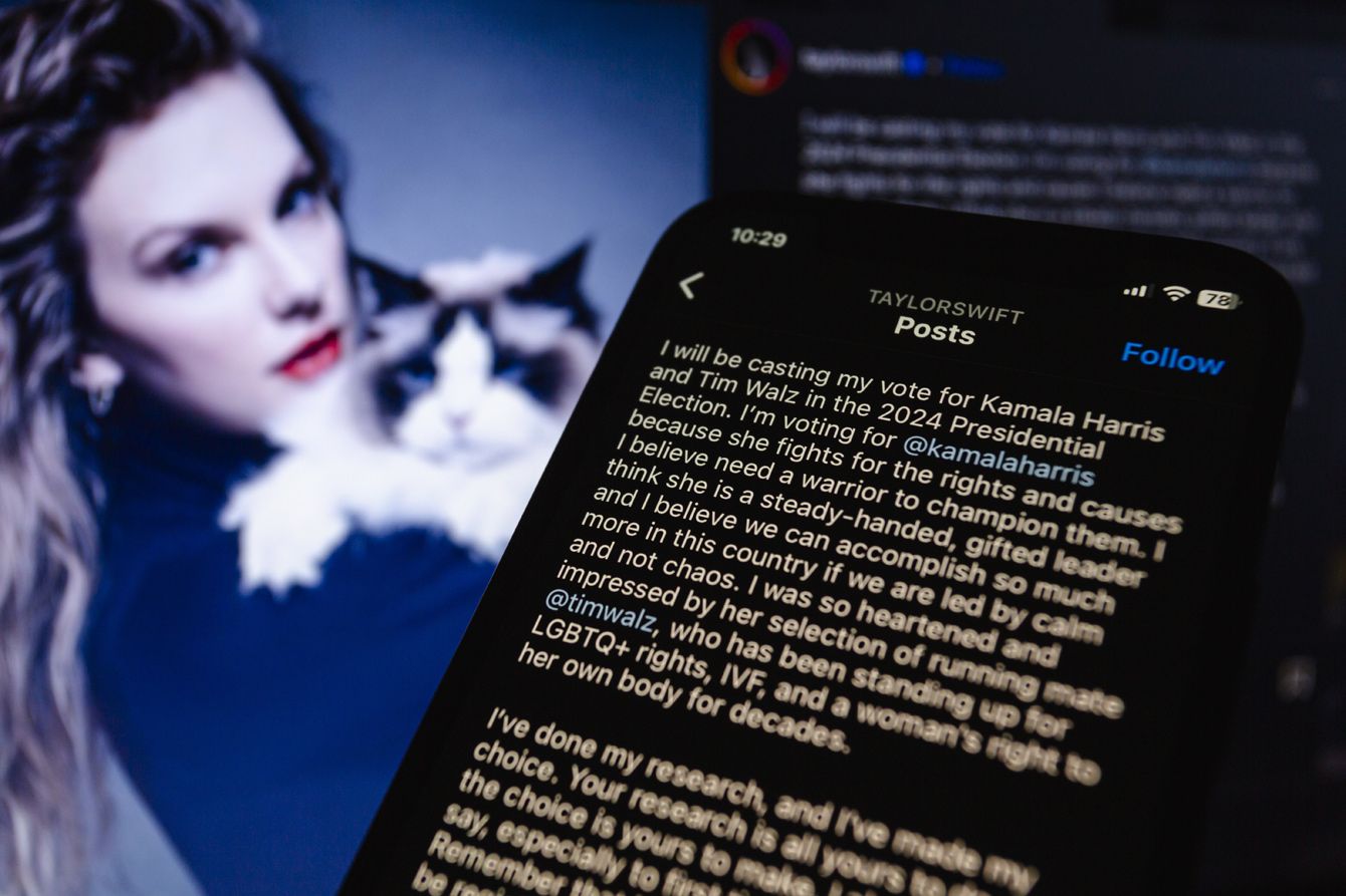 2024年9月11日、パラグアイ・アスンシオン:スマートフォンとモニターに表示されたテイラー・スウィフトのインスタグラムのカマラ・ハリスを支持する投稿。