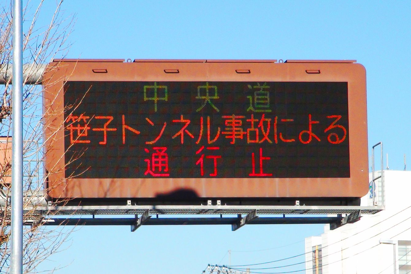 笹子トンネル通行止を知らせる電光掲示板。国道20号甲府市国母地区(2012年12月12日撮影)(写真=さかおり/CC-BY-SA-3.0/