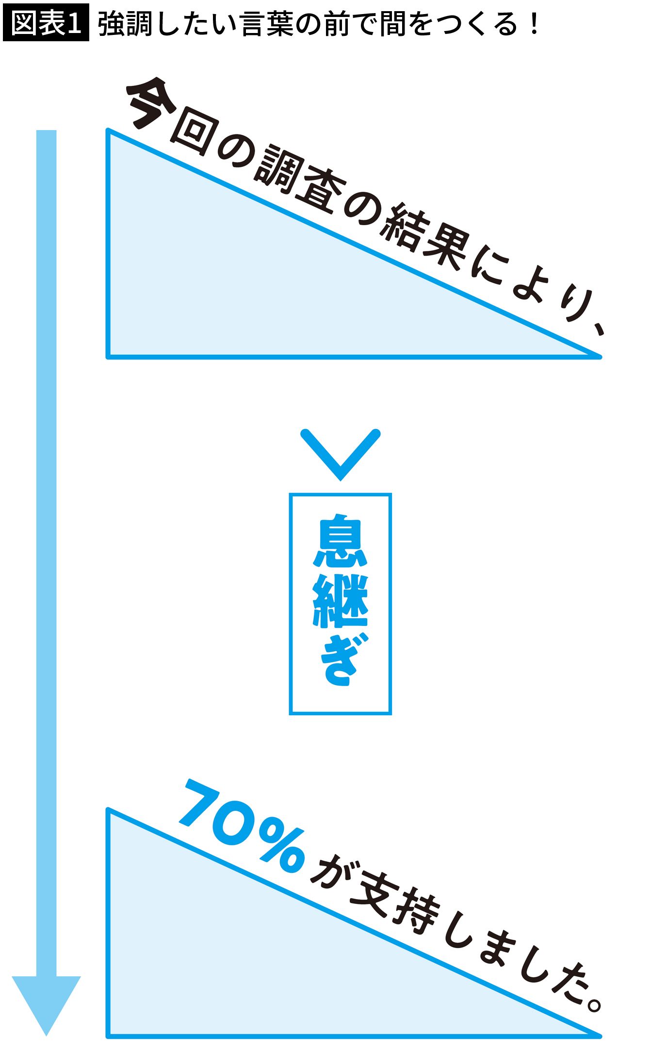 強調したい言葉の前で息継ぎをすると、自然な間が生まれて聞き手に息継ぎの後の言葉が印象的に伝わる。[『