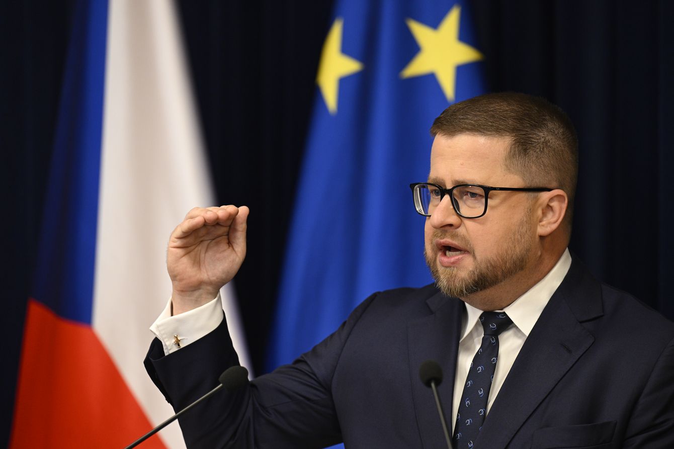 2024年6月27日、チェコ共和国のプラハで開催されたチェコ国立銀行(CNB)の金融政策決定会合後の記者会見で発言するアレス・ミフル総裁。