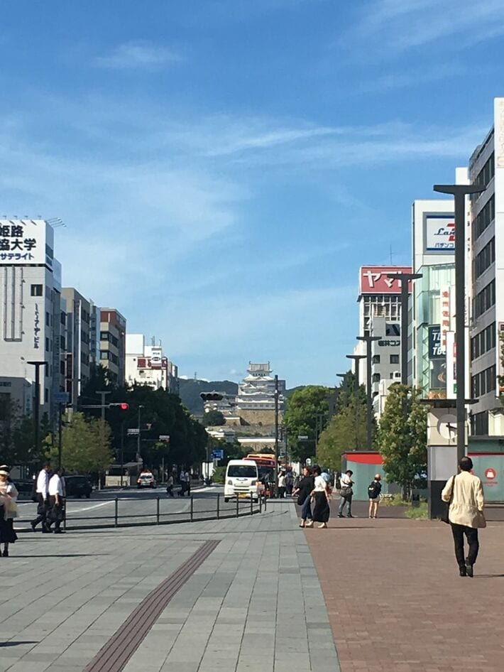 姫路駅から真っ白な姫路城をのぞむ。