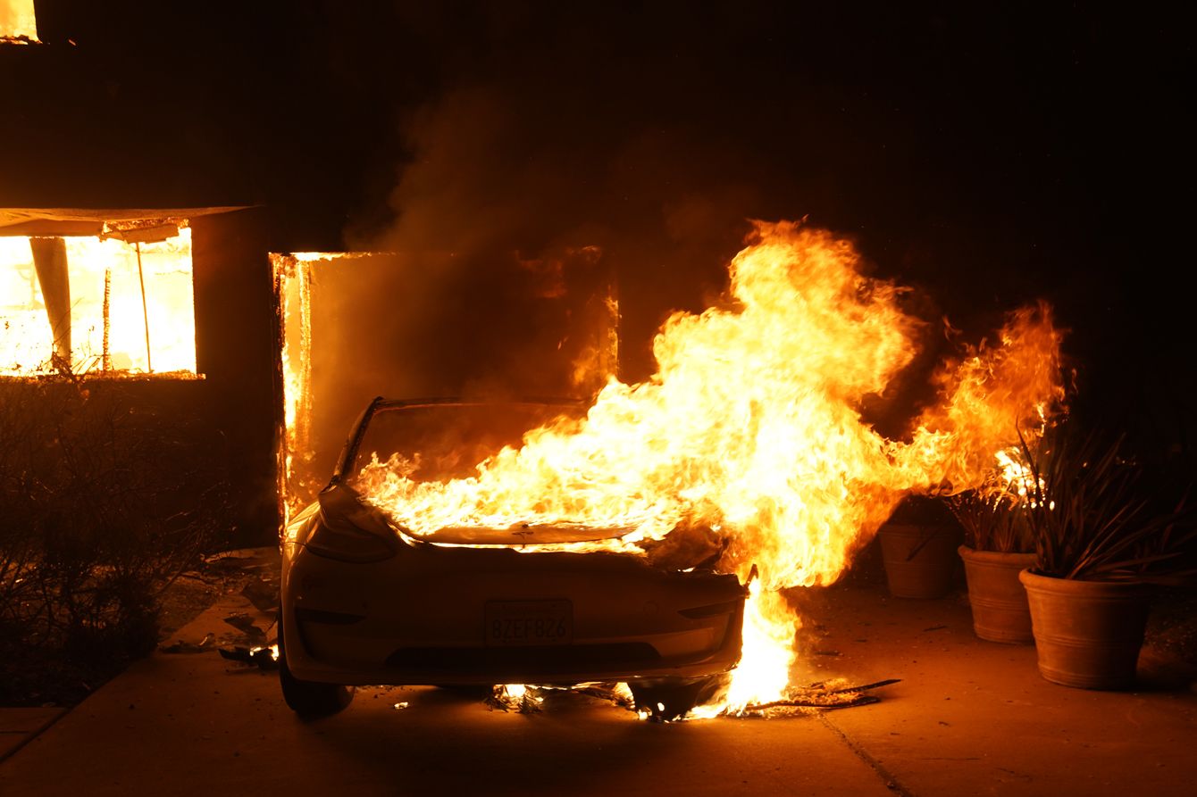 パシフィック・パリセーズの山火事で全焼したテスラ=2025年1月8日、アメリカ、ロサンゼルス