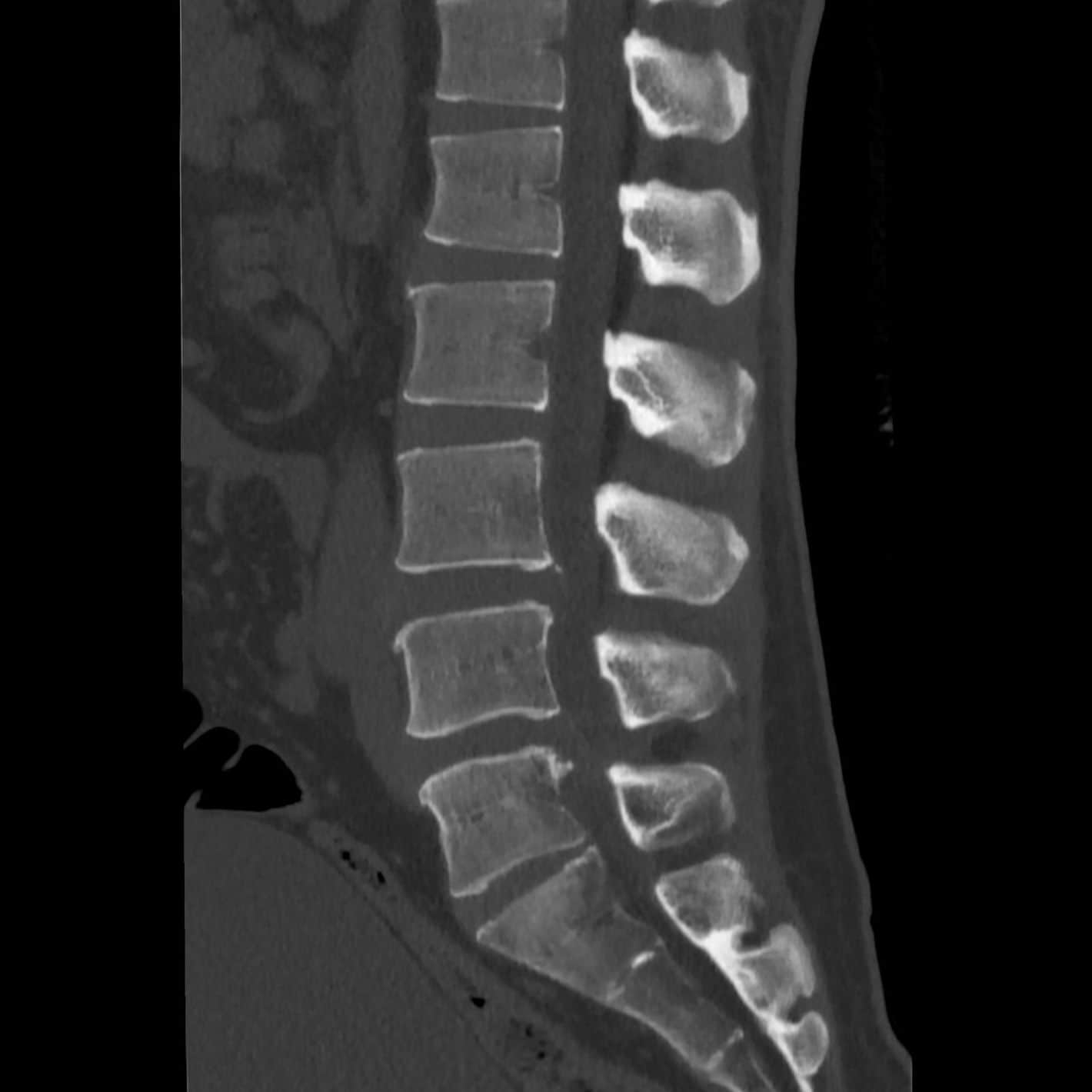 一般的に骨の形や配列、変形を詳しく調べるためCTを撮影する。この画像では一部に腰痛の原因となる可能性がある所見が認められた。(『