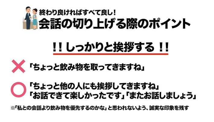 「ちょっと飲み物を取ってきます」と去るのは三流…立食パーティーで会話を切り上げる"一流の挨拶フレーズ"