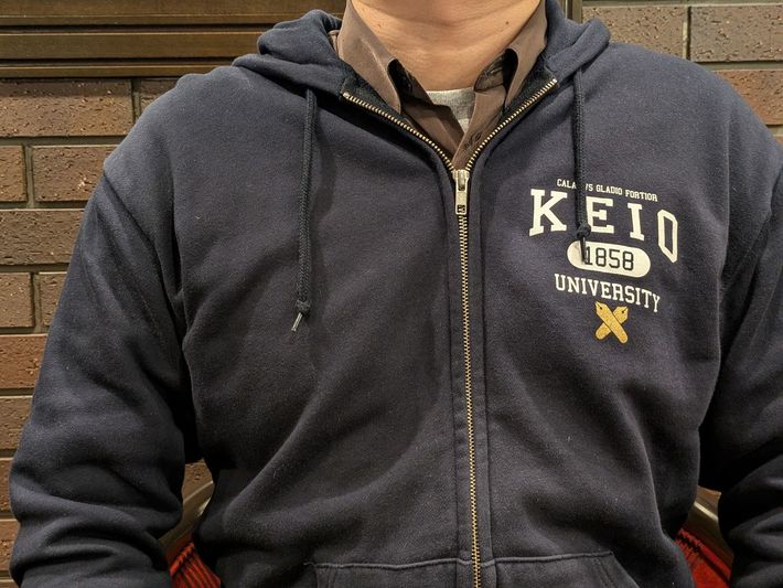 慶應のパーカーを着るえぐざま氏。