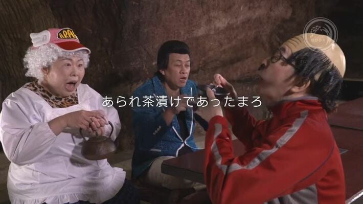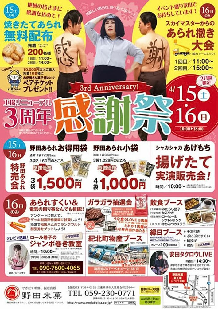 左端が「あらればあさん(恵子さん)」、右端は「おやじ(直営店店長)」。撮影場所は津市にある「磨洞温泉 涼風荘」。野田米菓CM「