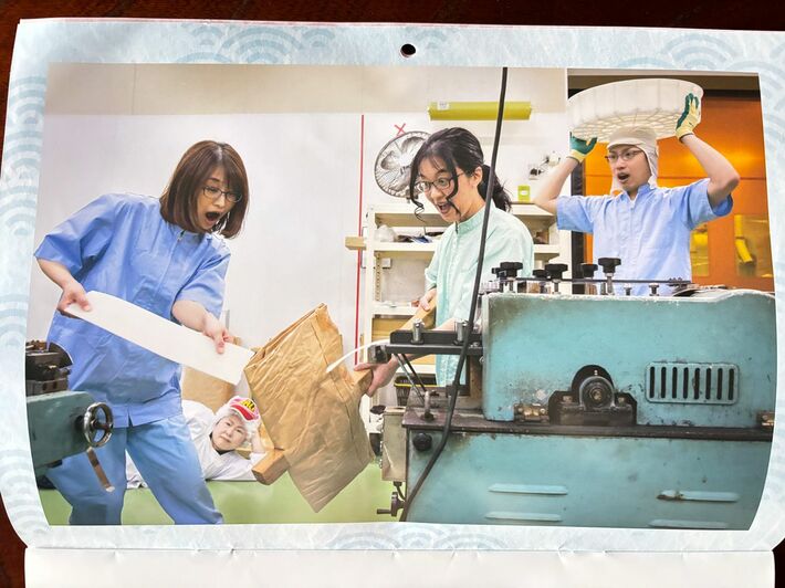 フォトグラファー・浅田政志さん撮影の写真で作った、野田米菓の2024年カレンダー。日常の一コマのようなシーンの後ろに、寝転んだ恵子さんがいるシュールな一枚