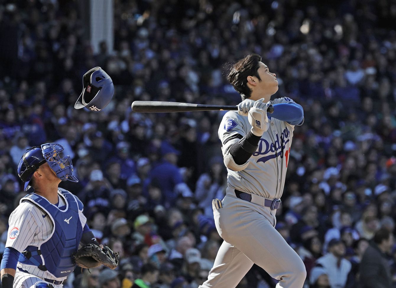 カブス戦の3回、中飛に倒れ、ヘルメットを飛ばすドジャース・大谷=2024年4月6日、シカゴ(共同)