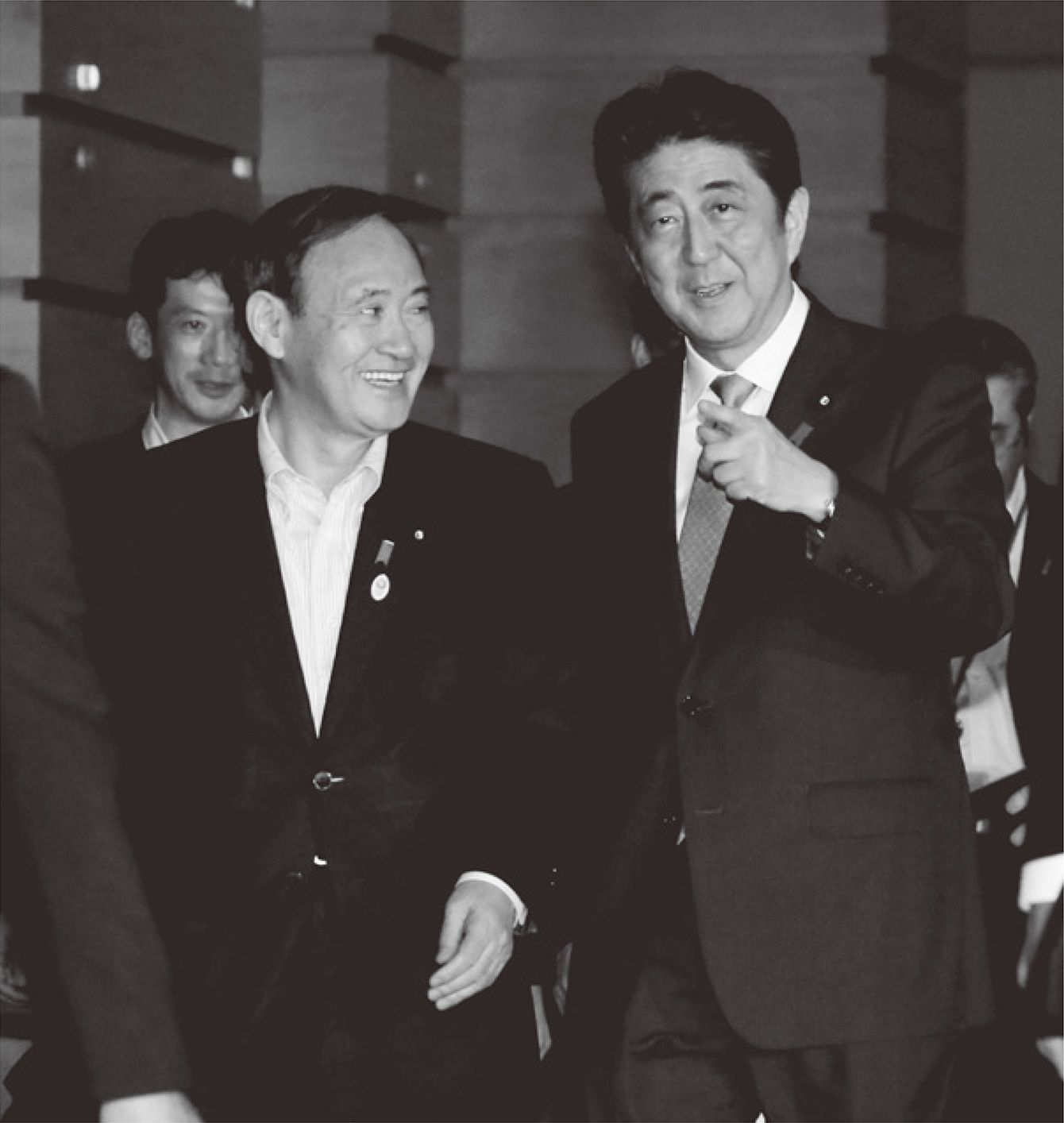 談笑する首相の安倍晋三(右)と官房長官の菅義偉=2015年8月10日、首相官邸〔出典=『