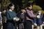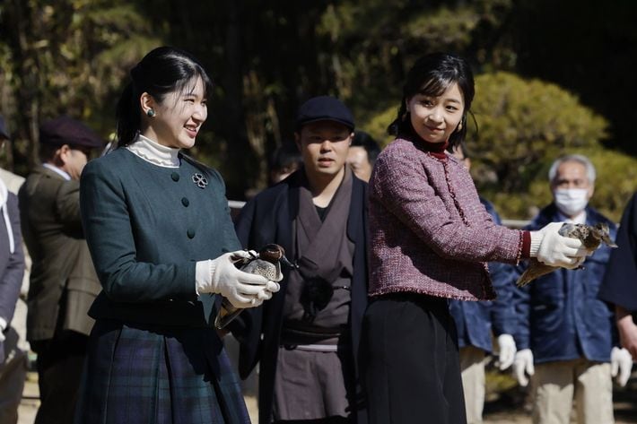 宮内庁新浜鴨場でカモの放鳥に臨まれる天皇、皇后両陛下の長女愛子さまと、秋篠宮家の次女佳子さま=2025年2月14日正午ごろ、千葉県市川市