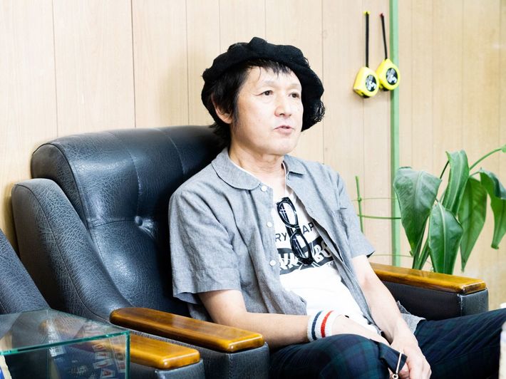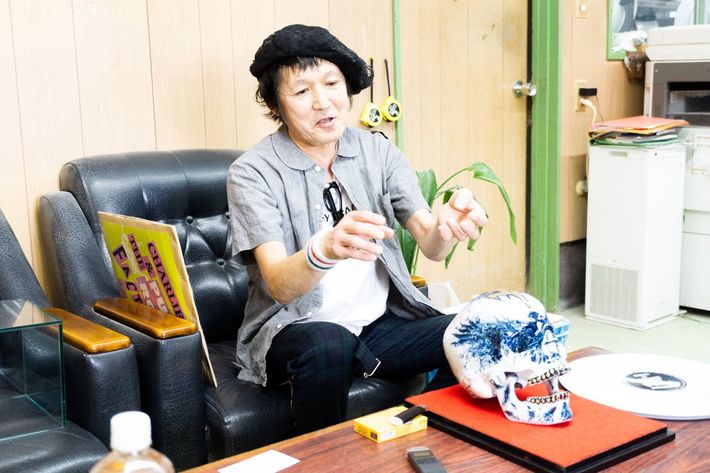 親峰武堅の事務所でインタビューに応えるカズキさん
