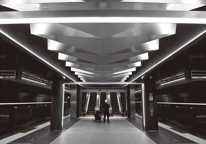 夢洲駅のホーム。天井は折り紙がモチーフという=2024年10月31日、大阪市此花区〔出典=『