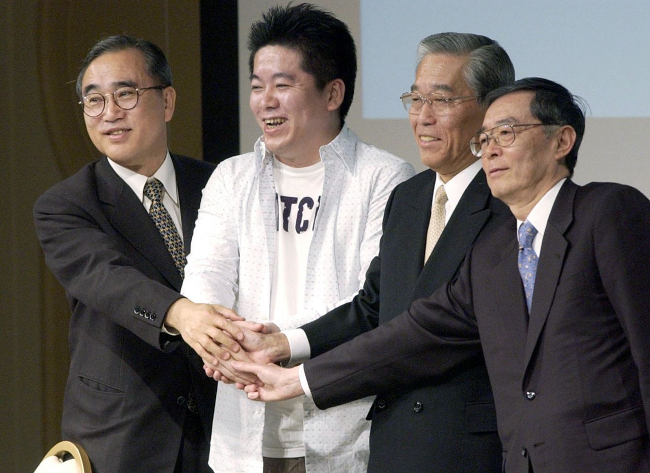 ニッポン放送経営権を巡り和解し、記者会見でフジサンケイグループ側と握手するライブドア社長の堀江貴文氏(左から2人目)=2005年4月、東京都内のホテル