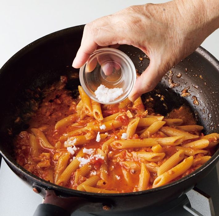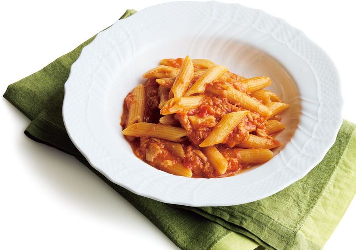 ペンネはゆでずにそのまま加えて手間と時間を大幅カット。仕上げを豪華にするなら、パルミジャーノ・レッジャーノチーズやちぎったバジル、パセリのみじん切りをふっても。[出所=『
