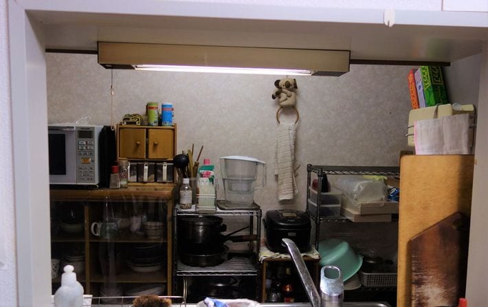 著者が過去に住んでいた部屋のキッチンは、幅1.8メートル、通路部分は1メートルしかなく、食洗機どころか、ストックの食材も入りきらなかった。