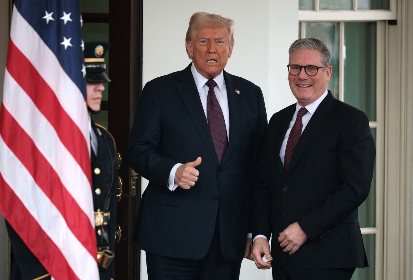 2025年2月27日、ワシントンD.C.のホワイトハウスに到着したキーア・スターマー英首相を出迎えるドナルド・トランプ米大統領。