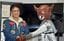 「甲府星人」と握手する「甲府UFO事件」の目撃者・山畠克博さん=2024年2月、甲府市