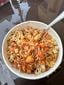エジプトの国民食、コシャリ。米とマカロニとスパゲッティなどのパスタ、レンズ豆とひよこ豆を混ぜ合わせて、トマトソースをかけたものです。