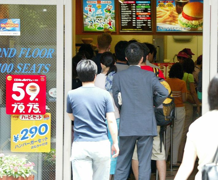 2002年8月5日、ハンバーガーが59円に値下げされ、にぎわいを見せるマクドナルド(東京・港区神谷町)
