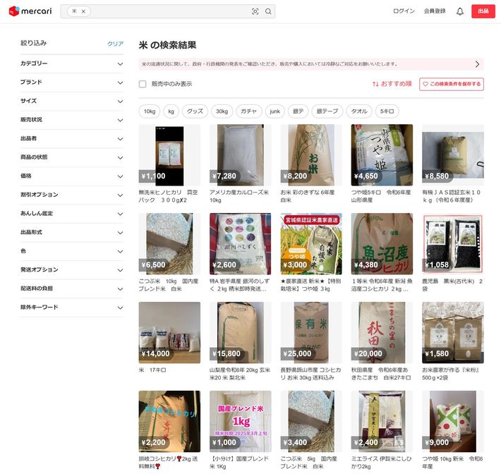 メルカリで販売されているコメ(2025年3月11日、「メルカリ」サイトをキャプチャー)