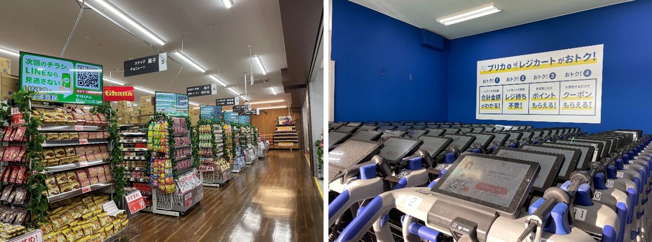 タブレット端末とスキャナーが搭載されたレジカート(右)。デジタルサイネージの内容は時々で変化する。