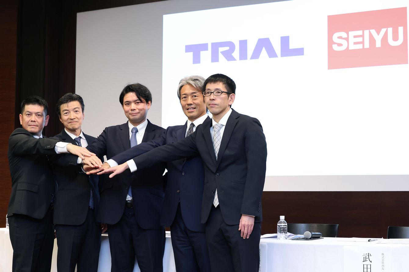 写真撮影に応じるトライアルホールディングス(HD)の亀田晃一社長(左から2人目)と西友の野村優執行役員(右から2人目)ら=2025年3月5日、東京都千代田区