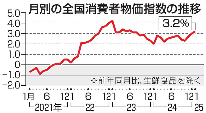 全国消費者物価指数の推移 1月全国物価3.2%上昇(月別の全国消費者物価指数の推移)