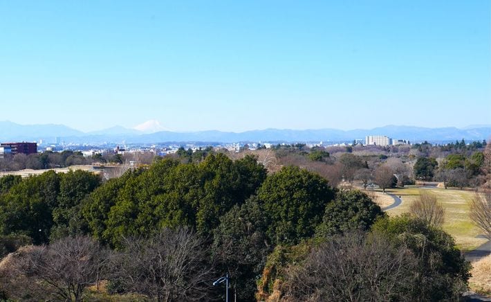 GREEN SPRINGSの屋上から見える昭和記念公園と富士山の眺望
