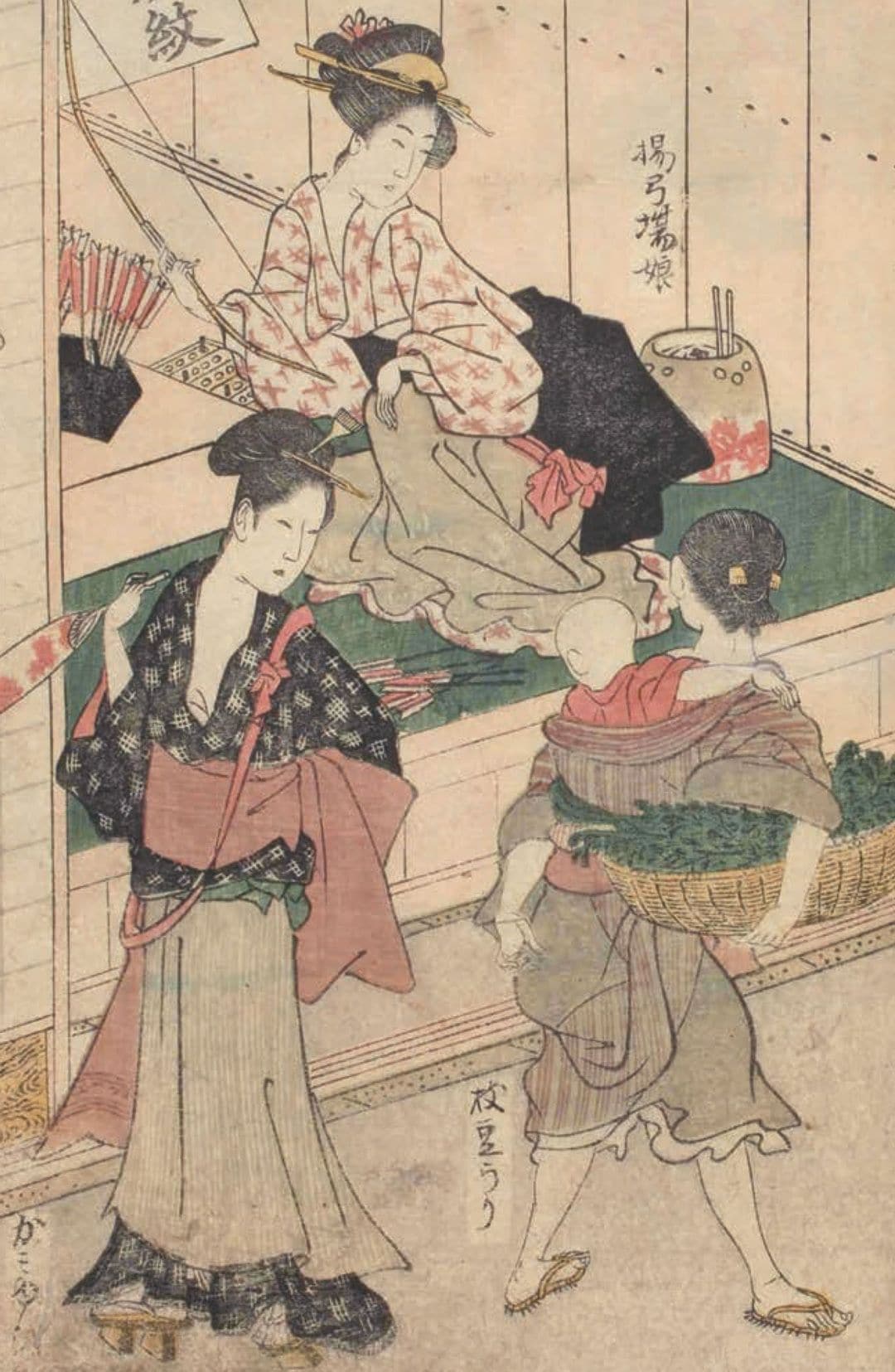 赤ちゃんを背負い、枝ごとゆで上げた枝豆を傍らに抱えて長屋の前を売り歩く「枝豆」売り。『絵本時世粧』歌川豊国 享和2(1802)年。[出所=『