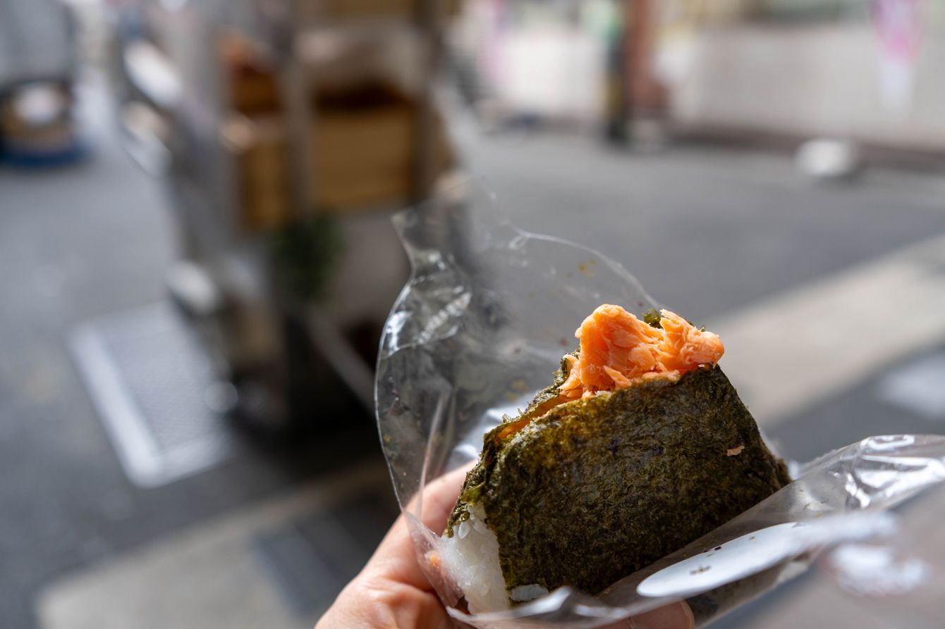 筆者は鮭おむすびを購入した。具がはみ出るほど大きい