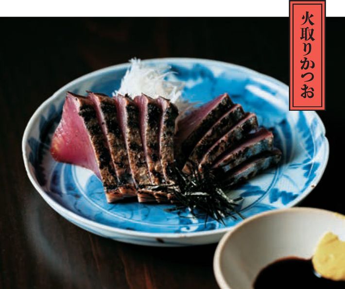 「火取りかつお」とは、鰹に塩を振ってしめ、皮目を炙ったもの。薬味に白髪ねぎ、みょうが、生姜を混ぜて添える。辛子と醤油でいただくもよし、酢を付けてもまた美味。[出所=『
